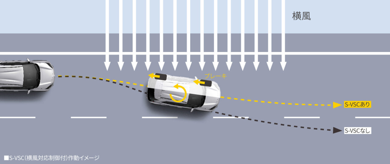 Pertama di mobil produksi Toyota, Yaris Cross dilengkapi S-VSC dengan lateral wind control yang berperan saat angin lateral kuat terdeteksi saat berkendara di jalan raya agar menjaga kendaraan tetap pada jalurnya untuk mendukung berkendara yang aman.