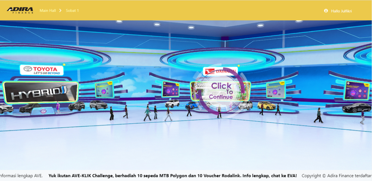 Masing-masing hall memiliki "booth" layaknya pameran offline dan untuk melihat lebih dekat arahkan ke booth kemudian "click to continue". Untuk kembali, klik "Main hall" di sebelah logo Adira Finance.