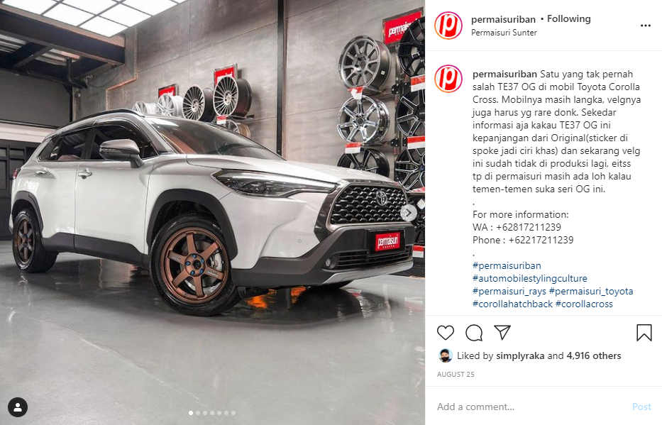 Sebelumnya Corolla Cross memiliki pelek standar 18 inci dengan PCD 5/114,3 seperti mobil Jepang pada umumnya sehingga akan memiliki banyak pilihan namun Permaisuri hanya menawarkan empat model yang bisa ditunjukkan ke pelanggan.