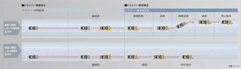 Apabila sistem mendeteksi bahwa pengemudi dalam kondisi tidak sehat dari tidak adanya respon saat diberi peringatan, mobil akan dihentikan lajutnya dan menyalakan lampu hazard secara otomatis untuk memberi peringatan kepada pengguna jalan lain.