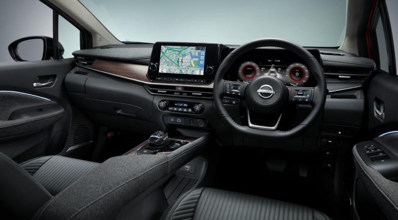 Panel instrumen bagian bawah dan konsol tengah memiliki lapisan serat kayu, sementara trim pintu, sandaran tangan depan, dan panel instrumen semuanya dilapisi kain seperti wol.