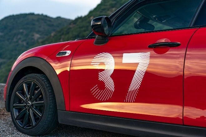 Nomor start 37 juga muncul pada elemen indikator samping yang dikenal sebagai side scuttles. Fitur lainnya adalah lampu depan LED dan lampu belakang berdesain Union Jack, stiker dengan tulisan “Paddy Hopkirk Monte Carlo” dan satu garis bonnet putih di sisi kiri kap mesin memiliki tanda tangan pemenang "Monte" 1964.