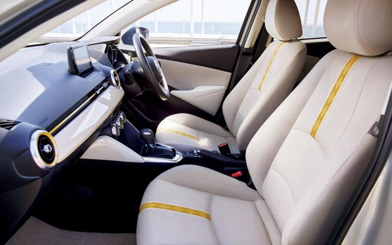 Sebetulnya trim interior tersebut memiliki paduan warna antara abu-abu dan beige atau greige, namun ketika terkena sinar matahari akan terpancar warna sunlight citrus seperti eksteriornya. Karpet bawaan Mazda2 Sunlight Citrus juga berwarna cerah mengikuti eksteriornya sehingga menambah kesan lapang.