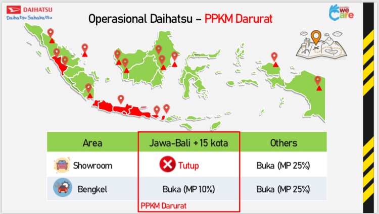 Hendrayadi Lastiyoso, Marketing & Customer Relations Division Head PT Astra International Daihatsu Sales Operation (AI-DSO) mengatakan, bagi area yang terdampak PPKM Darurat, Daihatsu menutup sementara seluruh showroom di Jawa-Bali, serta 15 kota/kabupaten lainnya.