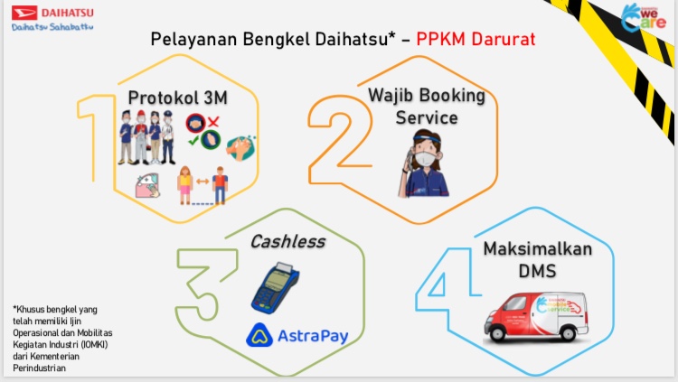 Ia menambahkan, guna mendukung program PPKM Darurat, khususnya di sektor transportasi, logistik, distribusi barang dan jasa, serta layanan kesehatan yang menggunakan armada kendaraan Daihatsu, layanan bengkel Daihatsu tetap beroperasi, namun dengan kapasitas terbatas.