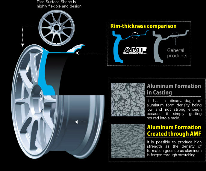 AMF masih menggunakan proses casting konvensional agar hasilnya lebih akurat dengan bentuk yang didesainnya, tetapi mengurangi under spring load karena proses pembuatan pelek dengan diputar dan dibuat setipis mungkin hingga ketebalan minimum yang dibutuhkan.
