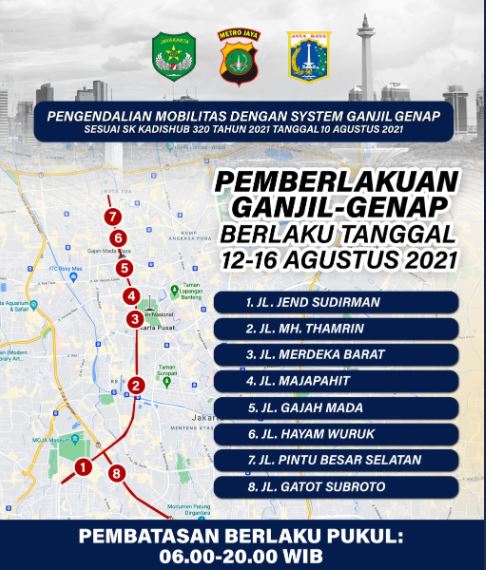Salah satunya adalah sistem ganjil-genap bagi kendaraan roda empat di wilayah DKI Jakarta, yang kembali diberlakukan pada 12-16 Agustus 2021. Kebijakan itu diberlakukan untuk membatasi mobilitas guna menekan kasus Covid-19.
