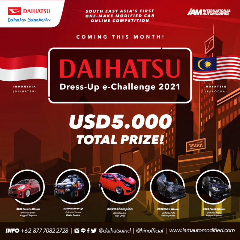 Berbeda dari sebelumnya, Daihatsu Dress Up e-Challenge 2021 ini tak hanya menantang para modifikator di seluruh Indonesia, namun juga hingga ke Malaysia yang akan berlangsung pada Oktober – Desember 2021.