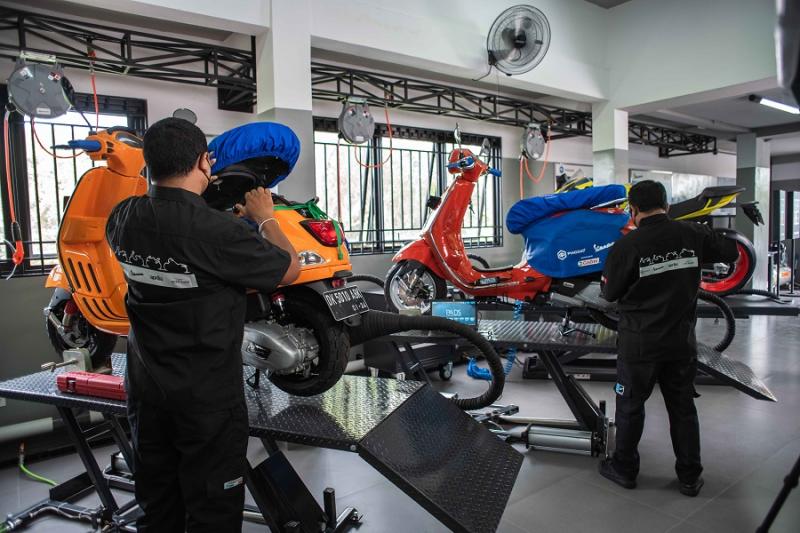 Di sana juga terdapat bengkel resmi di area seluas 100m2 dengan personel yang berkualifikasi tinggi yang didukung dengan tampilan terbuka, di mana customer dapat langsung melihat skuter dan motorbike kesayangan mereka, ditangani dengan penuh perhatian, dan dilayani dengan hati-hati.