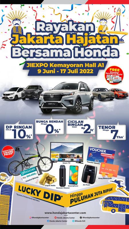 Melalui program penjualan bertajuk “Rayakan Hajatan Jakarta Bersama Honda”, promo yang ditawarkan antara lain; Lucky Dip hingga Puluhan Juta Rupiah, Down Payment (DP) mulai dari 10%, bunga rendah 0%, tenor 7 tahun hingga cicilan mulai dari Rp 2 Juta untuk pembelian model tertentu.*