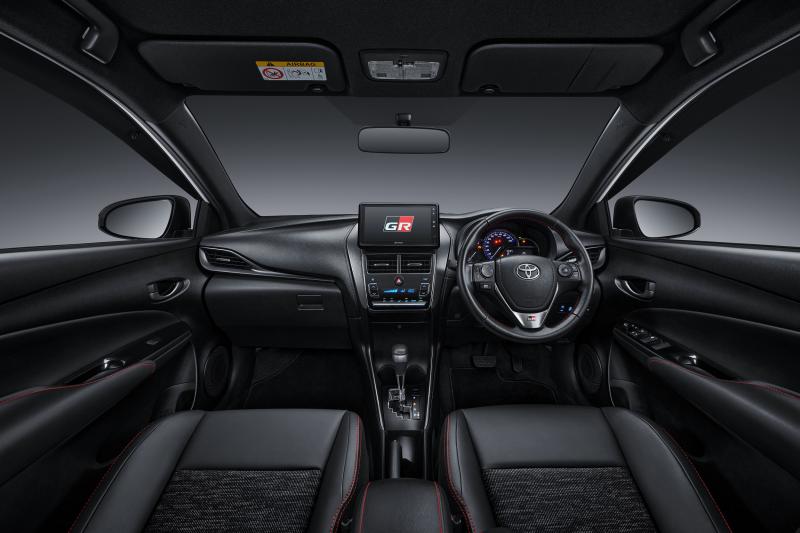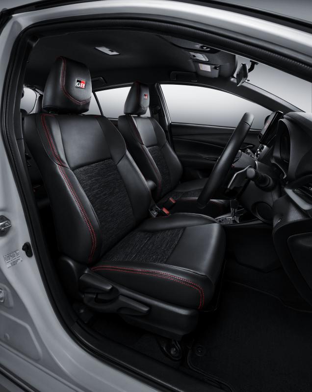 Di sektor interior, jok New Yaris menggunakan material kombinasi half fabric half leather untuk varian dengan 3 airbag, dan material full leather untuk varian 7 airbag, agar menambah kenyamanan pengemudi dan penumpang.
