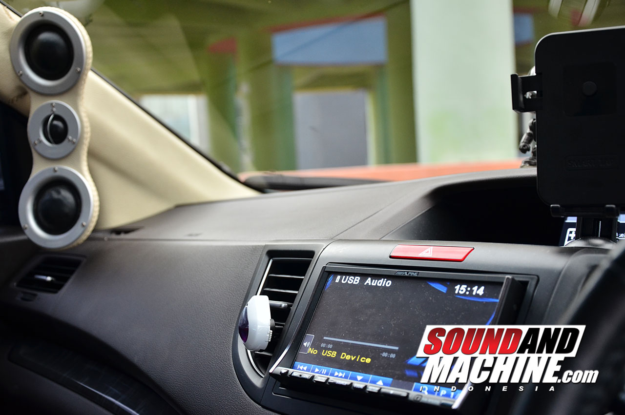 Intip pada bagian source suara yang teraplikasi pada CRV ini mengusung head unit audio double din Alpine IVA W-520E dikombinasikan dengan processor audio yang masih mengusung satu lebelan dengan head unit pada seri PXA-H800. Sementara untuk settingan suara semua dilakukan pada processor dan juga peranan passive, settingan suara memang disini masih mengandalkan peranan passive diracik oleh Mr. Hebron, ungkap Boy selaku punggawa workshop Audio Creation.Namun, untuk mengoptimalkan ruang kabin dari CRV ini, Boy selaku eksekutor membalutkan peredaman awal perubahan pada sistem audio mobil Christian. Dengan menggunakan peredaman Jacaranda pembalutan peredaman dilakukan keseluruh sektor, seperti floor, plafon, serta doortrim. Sehingga, minimalis gangguan suara yang masuk pun mampu diatasi serta dapat mengoptimalkan keseluruhan perangkat penyuara.