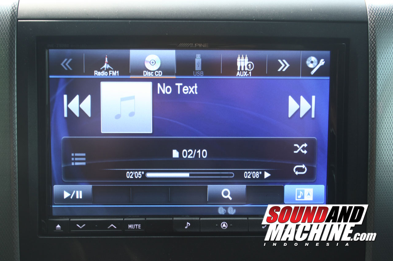 Spesifikasi: Head Unit : Alpine INE Z-928 E Processor: Mosconi 6to8 8V dan Controller Front Speaker: Flux SC 261 (2Way) Mid Speaker: Flux RC 361 (3Way) Rear Speaker: Flux SC (Tweeter + Midrange) Amplifier:o Mosconi AS 100.4 (2 Unit)o Mosconi AS 200.2 (1 Unit) Subwoofer: ScanSpeak 23W (1 Unit) Wiring:o RCA Fluxo Speaker Hitachio Power dan Ground RAMN Sound Damping: STPWarehouse:Bronson Audiowork